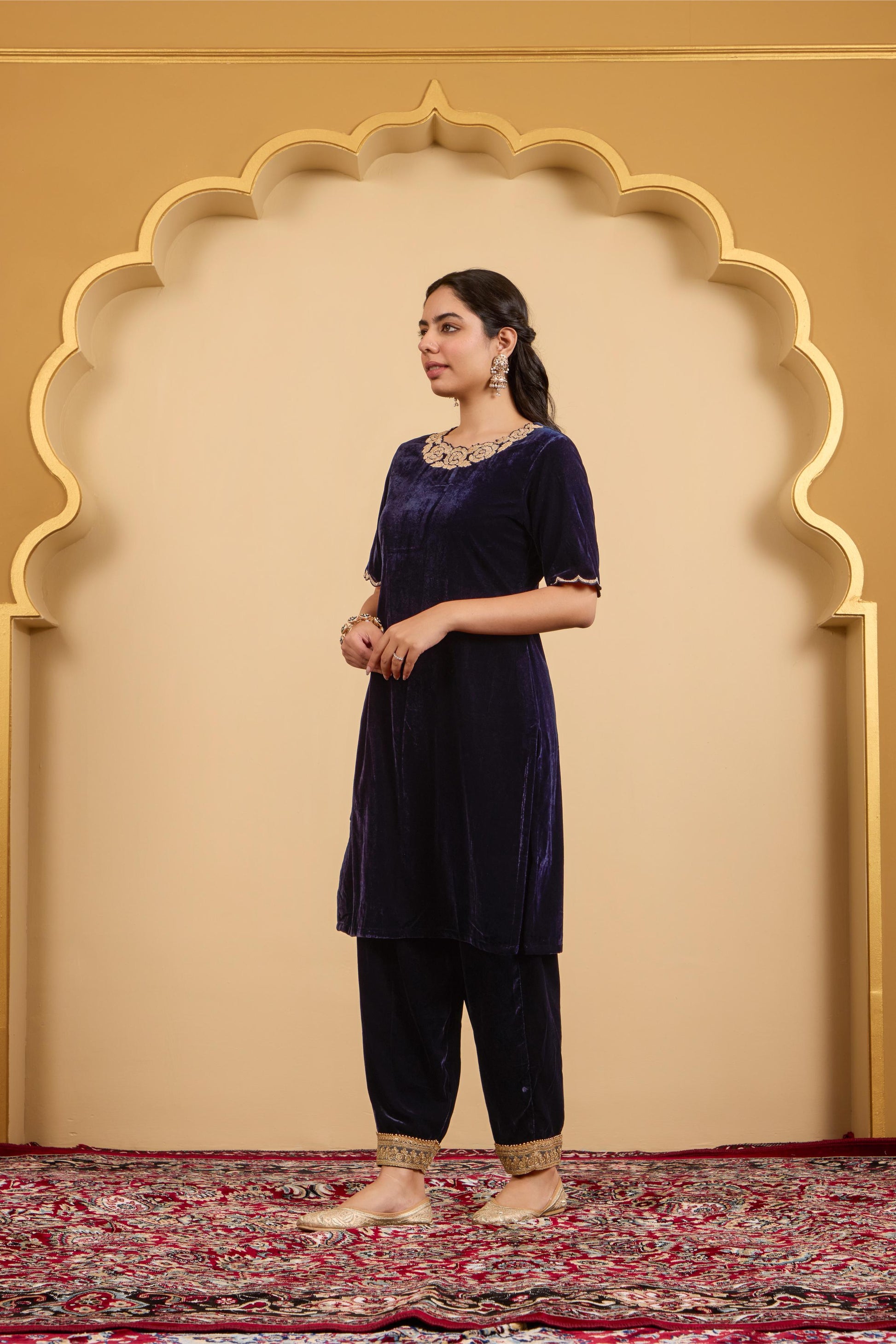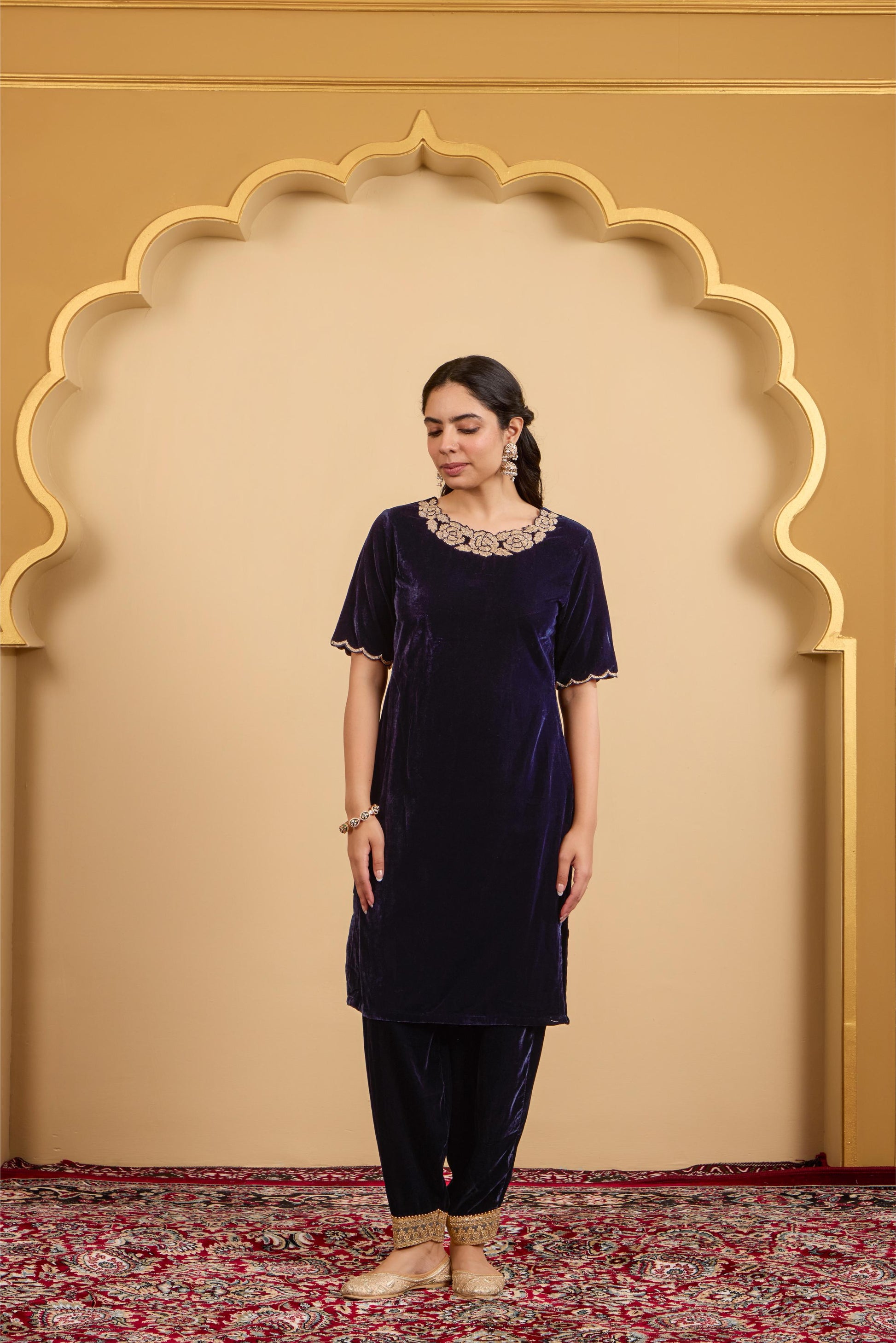 Elegant round-neck velvet kurta with elbow sleeves and delicate scallop detailing on the neck and cuffs. Paired with a matching salwar and a soft organza dupatta β perfect for festive evenings and special occasions.
